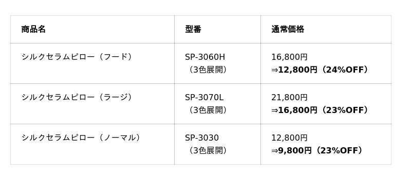 セール対象のシルクセラムピロー3タイプ、3カラー