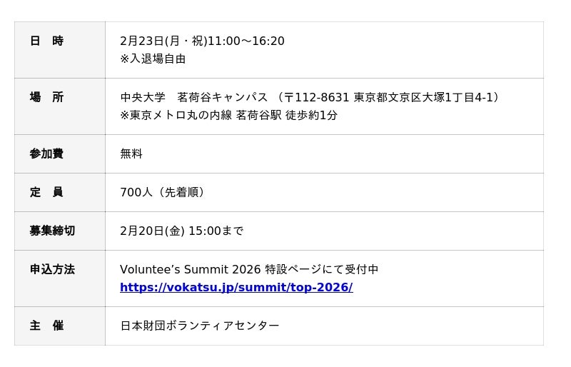 日本財団ボランティアセンター(以下日本財団ボラセン、東京都港区、会長 山脇 康)では、2月23日(月・祝)に開催するカンファレンス&アワードセレモニー「Volunteer’s Summit 2026」の参加者を募集しています。