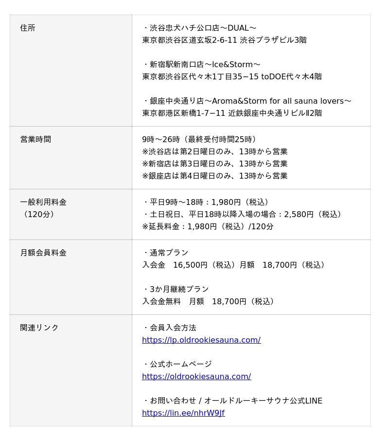 オールドルーキーサウナ 一般利用可能店舗概要(男性専用店)