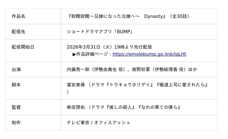 ショートドラマアプリ「BUMP」を運営するemole株式会社(本社:東京都目黒区、代表取締役:澤村直道、以下 emole/当社)は、昨年2025年1月期にテレビ東京で放映され、大きな反響を呼んだ『財閥復讐〜兄嫁になった元嫁へ〜』のショートドラマ版を、本日3月31日(火)19時より、他ショートドラマプラットフォームに先駆けて、配信開始いたします。