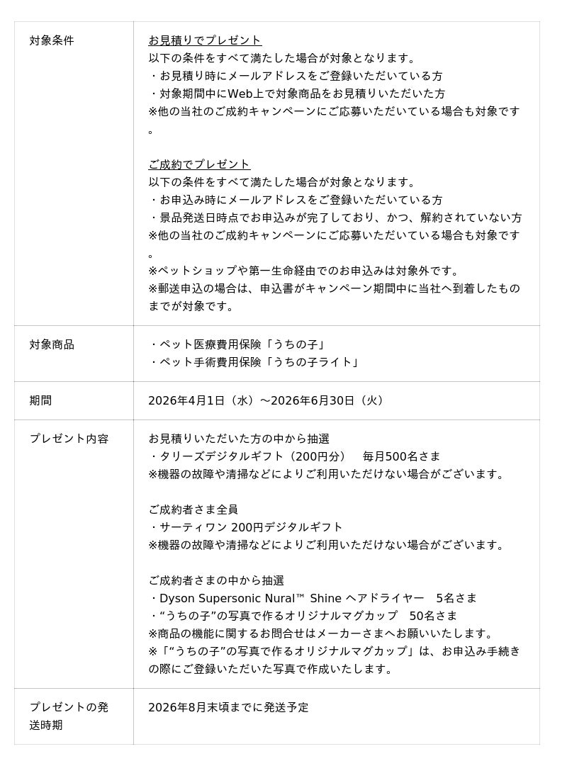 本キャンペーンは、社名変更を記念して、期間中にペット保険の新規お見積り・お申込みをいただいた皆さまに景品をプレゼントします。Webでお見積りいただいた方には抽選で毎月500名さまに「タリーズデジタルギフト(200円分)」が当たるほか、ご成約者さま全員には「サーティワン 200円デジタルギフト」をプレゼントします。さらに、ご成約者さまの中から抽選で合計55名さまに豪華景品が当たります。5名さまには最新のヘアドライヤー、50名さまには世界で1つだけの“うちの子”の写真で作るオリジナルマグカップをプレゼントします。