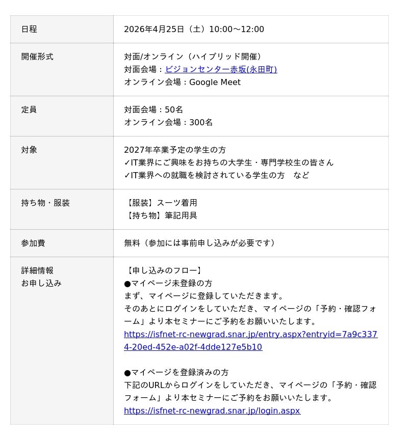 株式会社アイエスエフネット(本社:東京都港区/代表取締役:渡邉幸義、以下アイエスエフネット)は、2026年4月25日(土)に27年卒向け「社長登壇!トップセミナー」を開催します。このたび、より多くの方にご参加いただけるよう、ビジョンセンター赤坂(永田町)での対面開催に加え、オンラインでの参加形式を追加し、ハイブリッド開催とすることをお知らせいたします。当日は代表の渡邉が登壇し、就職活動中の学生に、アイエスエフネットの魅力を直接お伝えします。