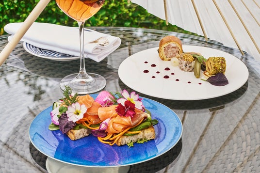 彩り豊かな料理やスイーツをロゼワインとともに味わう、春の午後。花の香りと春風がやさしく調和する「天空の庭」のテラスで、穏やかな季節の移ろいを堪能する5月限定の体験