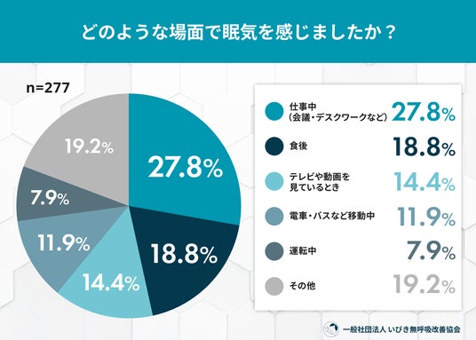 - 眠気を感じる場面:1位「仕事中(会議・デスクワーク)」、2位「食後」、3位「テレビ視聴中」