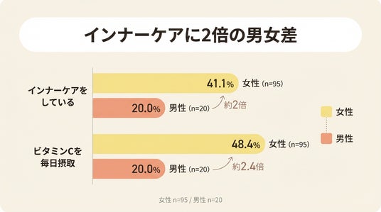 インナーケアの実施率は女性(41%)が男性(20%)の約2倍。ビタミンCの毎日摂取も同様に約2.4倍の差がある。男性は紫外線ダメージや美容への関心が低い傾向があり、「男性向けインナーケア啓発」という切り口が新たなアプローチとなりうる。