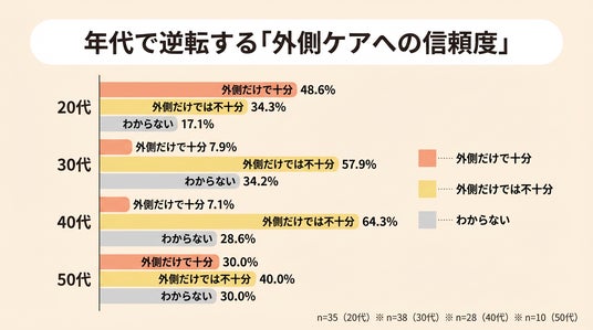 外側からのケアだけで十分かという問いに「いいえ(不十分)」と答えた割合は年代によって大きく異なることが判明した。