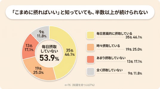 さらに、ビタミンCはこまめな摂取が有効だという知識を持つ人(n=76)においても、毎日実践できていない人は54%と過半数を超える。