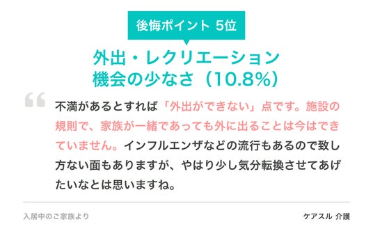- - 5〜8位には「外出・レク不足」「情報共有不足」「医療体制の不安」「日常報告の不足」が並び、施設内の様子が家族に見えにくいことによる不安や、社会的・心理的な孤立のリスクが浮き彫りになった。