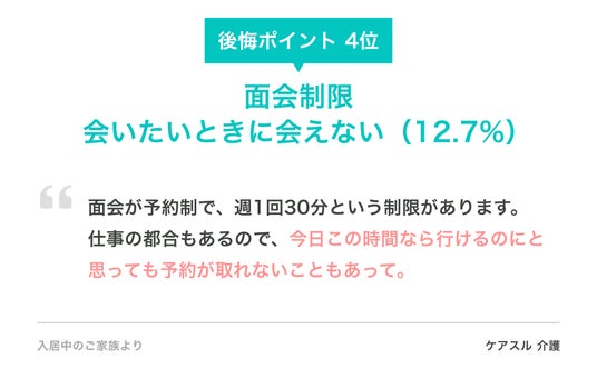 - - 3位 「費用の高さ・追加費用の不透明感(12.9%)」、4位 「面会制限(12.7%)」 と、入居前の見学や検討段階では実態を把握しにくい課題が浮き彫りに。