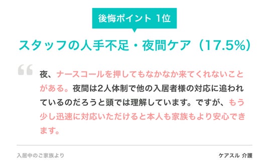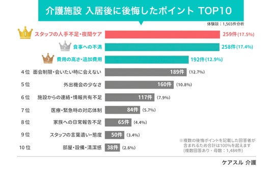 - - 後悔ポイント1位は 「スタッフの人手不足・夜間ケアの頻度(17.5%)」、2位は 「食事の内容・量・食形態への不満(17.4%)」と、僅差で並ぶ結果に。