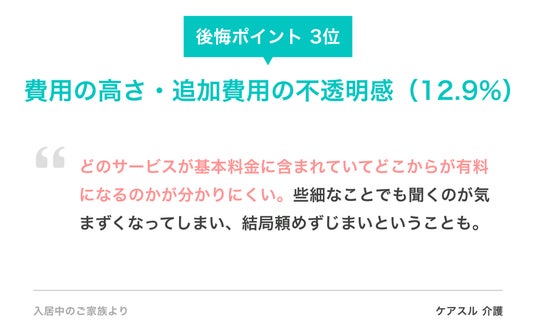 費用面では、「どのサービスが基本料金に含まれていてどこからが有料になるのかが分かりにくい。些細なことでも聞くのが気まずくなってしまい、結局頼めずじまいということも」(入居中の家族)という声のほか、「もう少し利用しやすい価格設定であれば、もっと長くお世話になりたかった」(退去済みの家族)と、費用が退去の直接的な要因となったケースもありました。