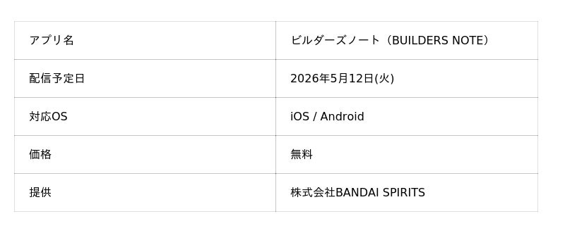 ガンプラ公式ファンコミュニティ「ビルダーズノート(BUILDERS NOTE)」は、ガンダムのプラモデル(以下、ガンプラ)における「手に入れる → 作る → つながる」という一連の楽しみを、ひとつの場で支えることを目指した、アプリ「ビルダーズノート(BUILDERS NOTE)」の事前登録を、App StoreおよびGoogle Playにて開始しました。正式リリースは2026年5月12日の予定です。