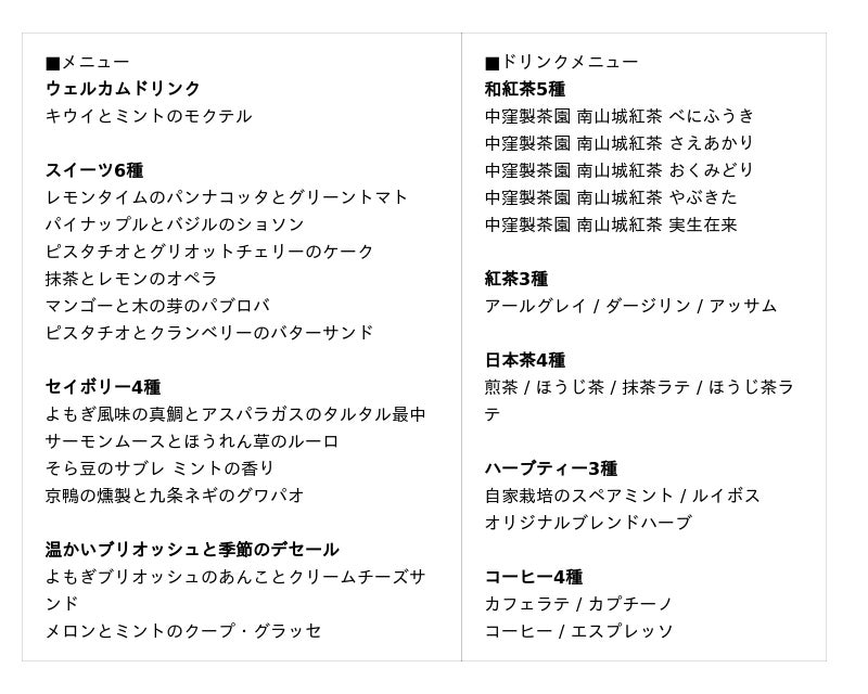 アフタヌーンティー「Riverside Cafe MUNI ~vert frais~」の概要は以下の通りです。