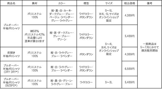 今季は吸水速乾性、汗ジミ軽減、透け防止といった機能性に特化した「ビズポロ 『DRY DRY(R)』」が新たに登場。従来のビズポロの特長を備えつつ、肌離れがよくさらっとした着心地で汗ジミが目立ちにくいことに加え、透けも防ぐことができる万能アイテムです。また、アクティブなシーンでも活躍する高いストレッチ性が魅力の「BIZSPO(R)」ラインはカラーと素材の展開を拡充。従来のビズポロについても、一部商品をオンライン限定にて5Lサイズを新規に展開し、より多くのお客様のニーズに対応できるようラインナップを揃えました。