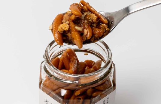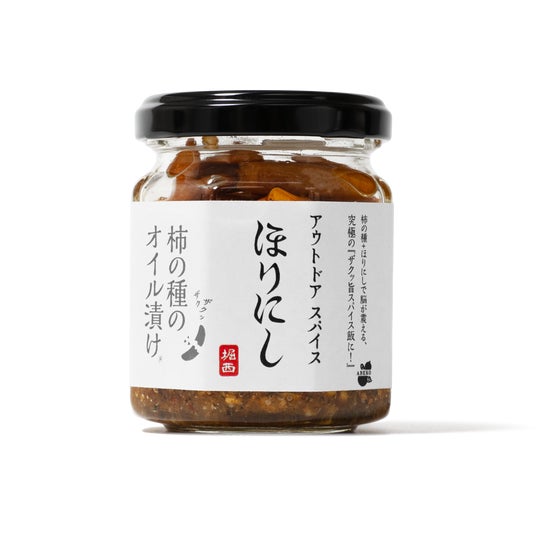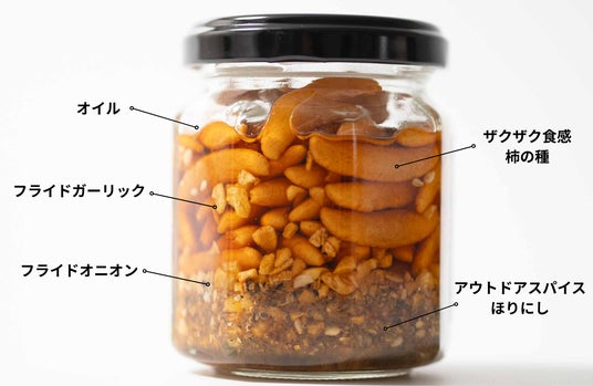 オイルをまとった柿の種に、ガーリックの香りとスパイスの旨みが特徴の「ほりにし」の味わいを絡めた、新しい"ご飯のおとも"です。コンパクトな瓶タイプだから持ち運びも手軽で、「なるべく身軽に、でも食事は妥協したくない」というアウトドア派の要望にしっかり応えます。ご飯はもちろん、枝豆や豆腐などのおつまみアレンジから、焼きそばやお肉などのメイン料理まで、ワンスプーンでぐっとおいしさが引き立ちます。柿の種のオイル漬けは、新潟県の老舗米菓メーカー・阿部幸製菓が手掛けています。オイル漬けにしても損なわれないザクザク食感は、確かな製造技術があってこそ。オイル漬けなのに、フニャフニャしていない。むしろザクザク歯応えを感じる、驚きの新食感。アウトドアショップを運営してきた当社だからこそ提案できる、アウトドアシーンの食体験にワクワクと喜びを届けるために生まれた新商品です。