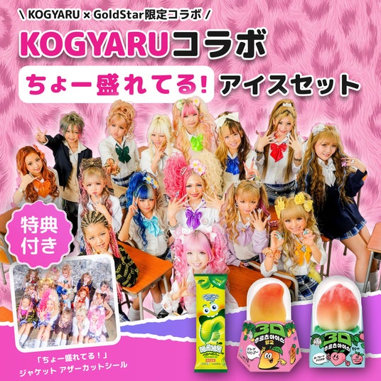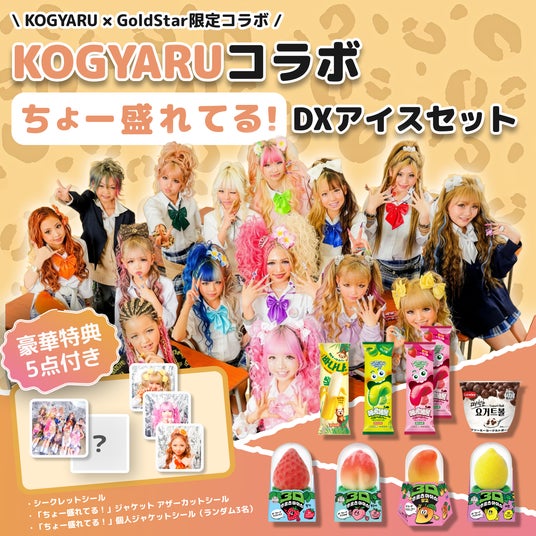 本リリースにあわせて、韓国発の人気アイス「ベロベロバー」や「3Dフルーツアイス」を販売する株式会社GOLD STARとのコラボ企画が決定いたしました。「ちょー盛れてる!」のリリースに連動した企画として、「ちょー盛れてる!」アイスセット(¥980+税)、「ちょー盛れてる!」DXアイスセット(¥2,980+税)の販売を予定しています。各セットには、KOGYARUメンバーの楽曲ジャケットアザーカットステッカーや個人ジャケットシール(ランダム3枚)、シークレットシールの豪華特典が5点が封入される予定で、ファン必見のアイテムとなっています。