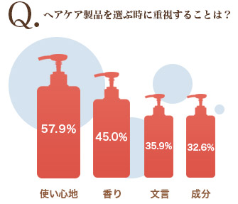 確かに製品の選び方はとっても重要。サロントリートメントはせいぜい月1回だという事を考えても、ホームケアが髪の状態を左右することは間違いありません。でも、製品選びのポイントは「使い心地」が57.9%で1位となり、次に多かったのが「香り」の45.0%。「どんな成分が入っているか」に重きを置いている人は32.6%にとどまりました。