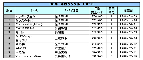 1988年は、スーパーアイドルグループ・光GENJIが社会現象となった年。ローラースケートを巧みに操り、颯爽と駆け抜ける姿に魅了された女のコは数知れず。この年の年間シングルランキングのTOP3は全て彼らの作品。1位「パラダイス銀河」(87.4万枚)、2位「ガラスの十代」(67.4万枚)、3位「Diamondハリケーン」(67.2万枚)と他を圧倒する勢いをみせた。