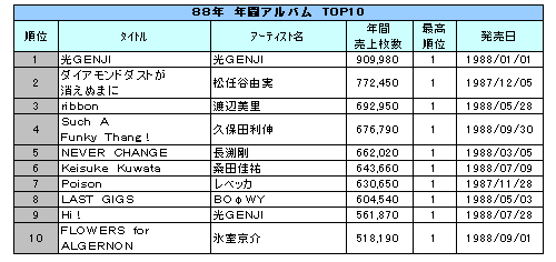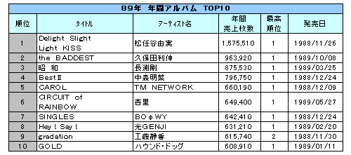 アルバムでは松任谷由実『Delight Slight Light KISS』(157.6万枚)がNo.1。“純愛”というアルバム・コンセプトが話題を呼び、社会的な流行語にもなった。 ここ数年、“純愛”系な小説やドラマが流行っているが、17年前は音楽が“純愛”の中心だったようだ。
