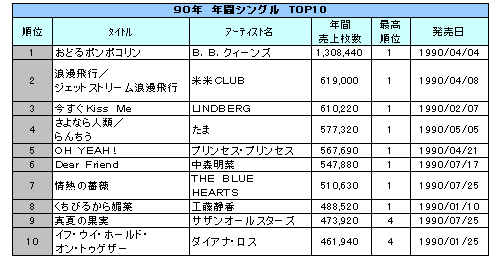 1990年のシングルNo.1は、大人気アニメ『ちびまる子ちゃん』のエンディングテーマ、B.B.クィーンズ「おどるポンポコリン」(130.8万枚)。アニメのテーマソングという枠から飛び出し、老若男女問わず愛され社会的ブームになったという点では、“平成のたいやきくん”とも言えるだろう。また、『ちびまる子ちゃん』は、この年の10月に、動画の視聴率としては史上最高の39.9%を記録するなど、ちびまる子ちゃんが大活躍!