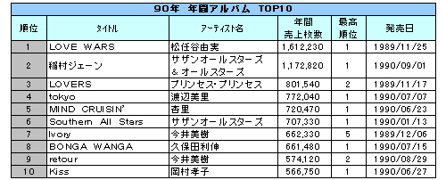 アルバムの1位は前年に続き、またまた1位を獲得したのは、松任谷由実『LOVE WARS』(161.2万枚)。今回のアルバムテーマは“恋の任侠”。女性の心をくすぐる作品がズラリと並んだ名盤。