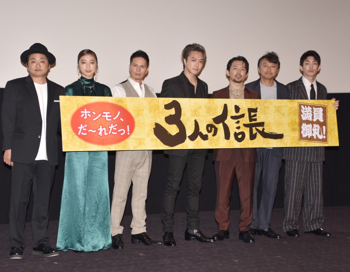 (左から)渡辺啓監督、坂東希、市原隼人、TAKAHIRO、岡田義徳、相島一之、前田公輝=映画『3人の信長』公開記念舞台あいさつ (C)ORICON NewS inc. (2/12枚)