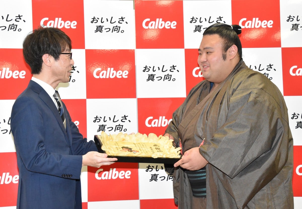 松本知之執行役員(左)から感謝状をもらう貴景勝=カルビー『ポテトチップス うすしお味』PR大使感謝状贈呈式 (C)ORICON NewS inc. (4/18枚)