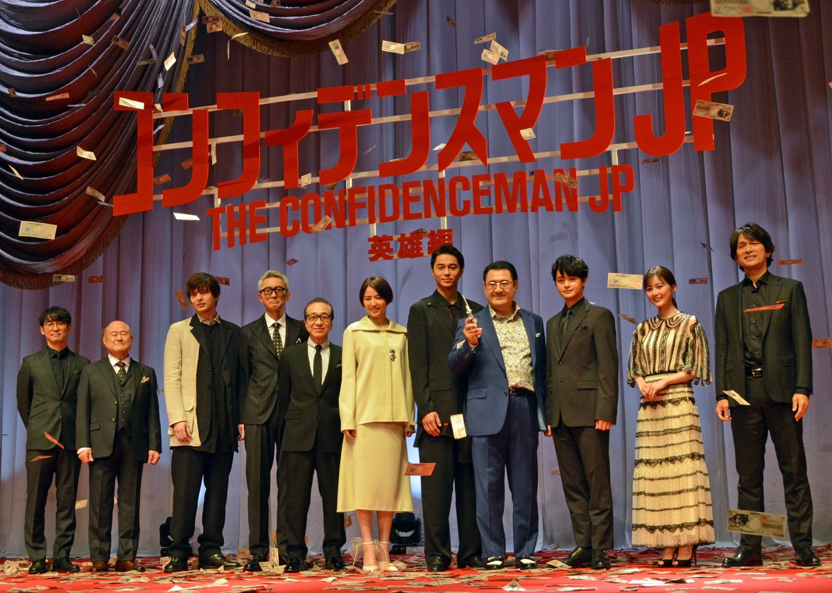 映画『コンフィデンスマンJP 英雄編』ワールドプレミアに参加した(左から)田中亮監督、角野卓造、城田優、松重豊、小日向文世、長澤まさみ、東出昌大、小手伸也、瀬戸康史、生田絵梨花、江口洋介 (C)ORICON NewS inc. (5/12枚)