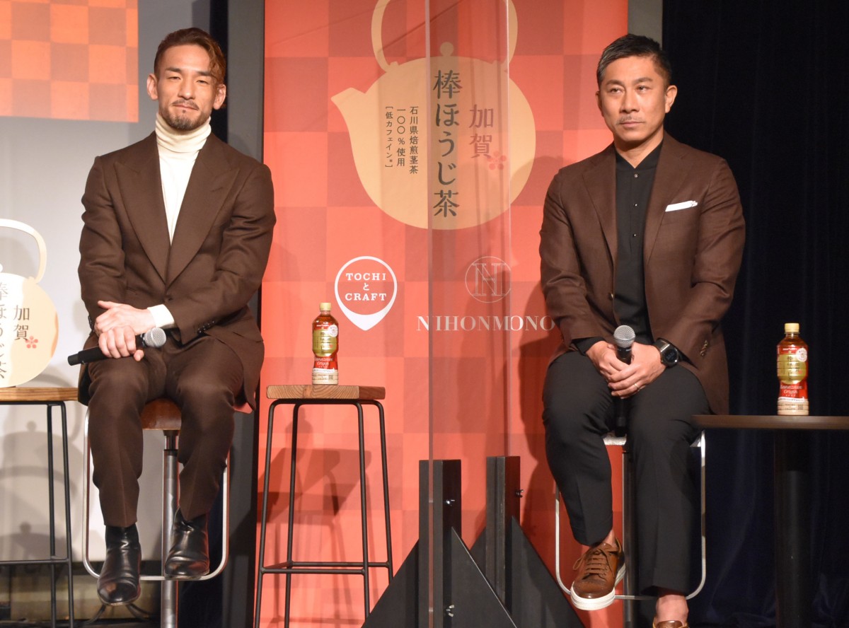 ポッカサッポロ『加賀棒ほうじ茶』リニューアル発表会に参加した(左から)中田英寿、前園真聖 (C)ORICON NewS inc. (2/2枚)
