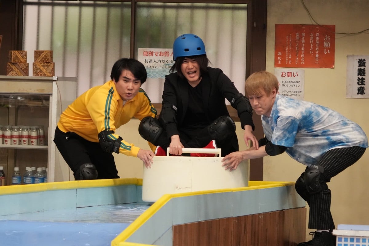9日放送の『新しいカギ』「箱根ソープウェイ選手権」に出演する(左から)国崎和也、伊藤幸司、お見送り芸人しんいち(C)フジテレビ (2/6枚)