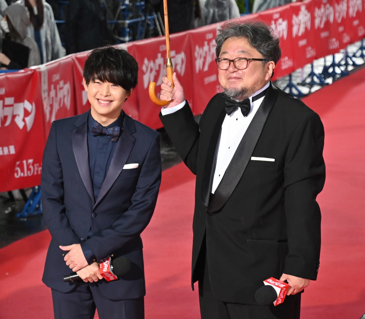 相合い傘をした(左から)有岡大貴、樋口真嗣監督=『シン・ウルトラマン』のレッドカーペットイベント (C)ORICON NewS inc. (1/16枚)