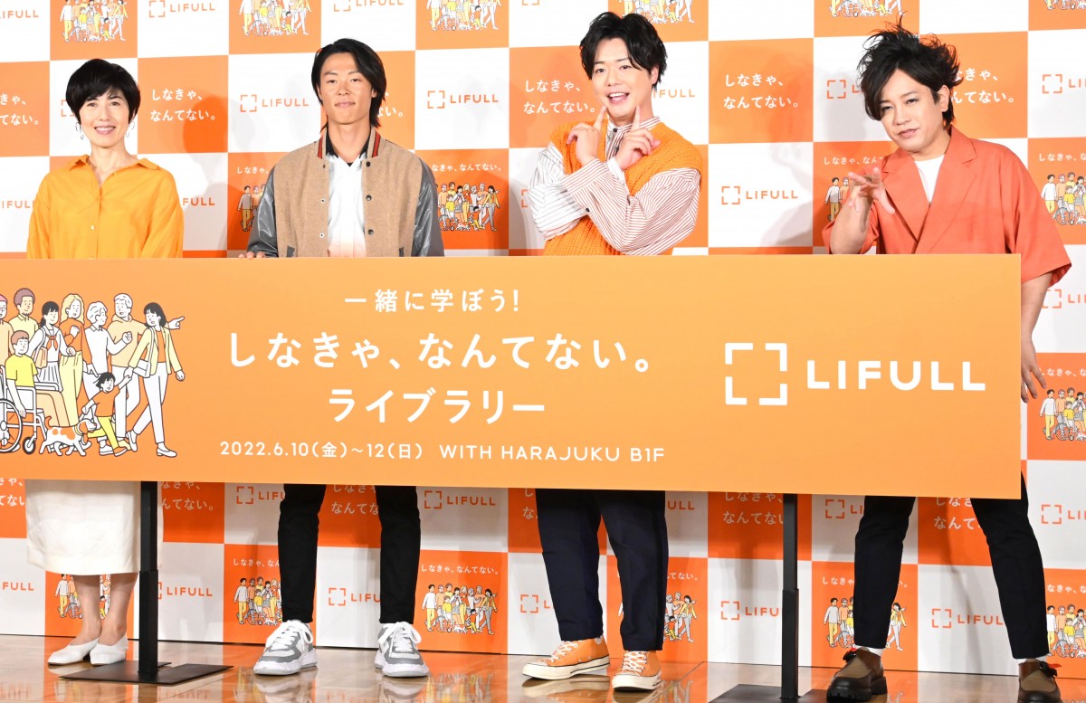 『一緒に学ぼう!LIFULL「しなきゃ、なんてない。ライブラリー」』開催記念イベントに登壇した(左から)小島慶子、小林陵侑選手、シュウペイ、松陰寺太勇 (C)ORICON NewS inc. (2/9枚)