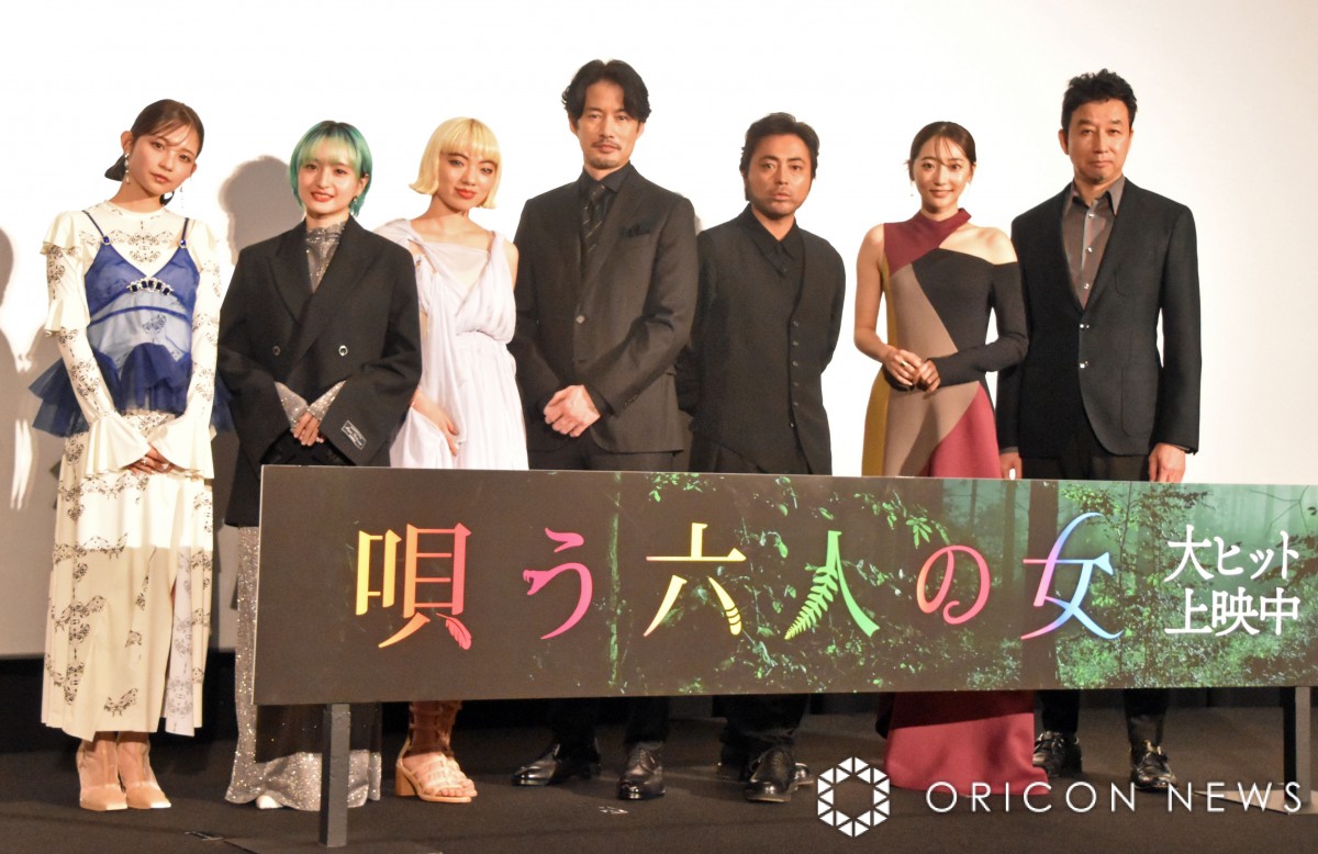 映画『唄う六人の女』公開記念舞台あいさつに登壇した(左から)桃果、萩原みのり、アオイヤマダ、竹野内豊、山田孝之、武田玲奈、石橋義正監督 (C)ORICON NewS inc. (3/9枚)