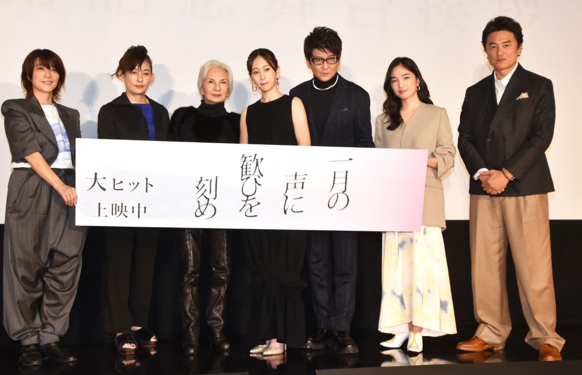 (左から)三島有紀子監督、片岡礼子、カルーセル麻紀、前田敦子、哀川翔、松本妃代、原田龍二 (2/9枚)