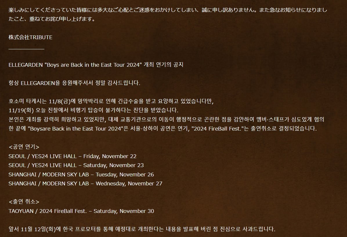 • ELLEGARDEN、アジアツアーのソウル・上海公演を延期を発表(公式サイトより/日本語含む4つの言語で掲載) ELLEGARDEN、アジアツアーのソウル・上海公演を延期を発表(公式サイトより/日本語含む4つの言語で掲載) ELLEGARDEN、アジアツアーのソウル・上海公演を延期を発表(公式サイトより/日本語含む4つの言語で掲載) ELLEGARDEN、アジアツアーのソウル・上海公演を延期を発表(公式サイトより/日本語含む4つの言語で掲載) ELLEGARDEN、アジアツアーのソウル・上海公演を延期を発表(公式サイトより/日本語含む4つの言語で掲載)