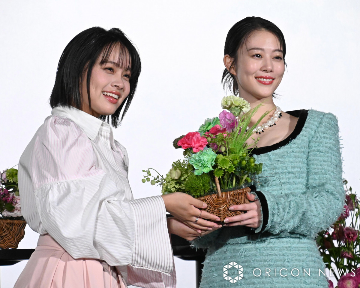 高畑充希&清水美依紗、互いにひざまずき花束交換で“キュン” 映画『ウィキッド』舞台あいさつで華々しく