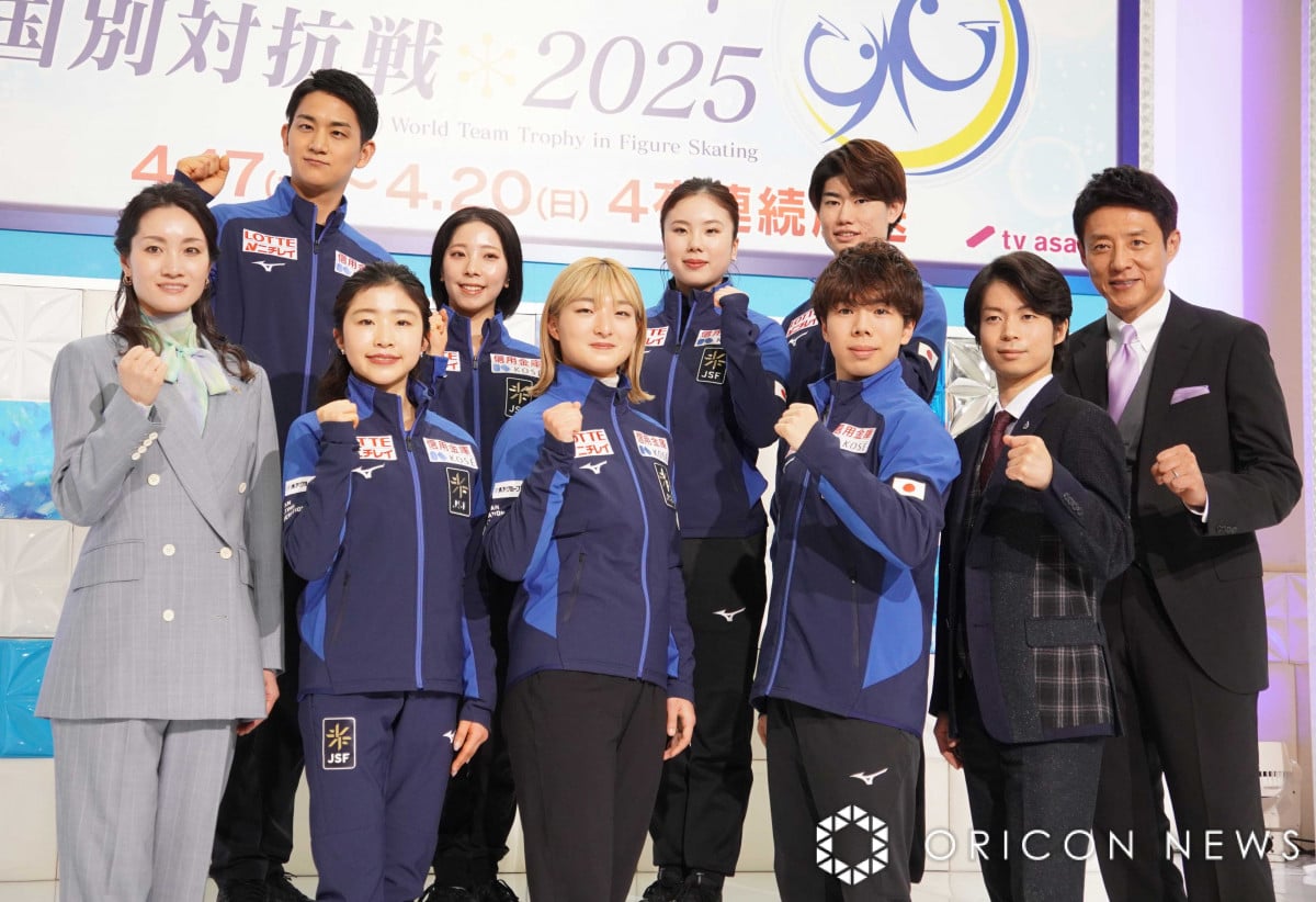 『世界フィギュアスケート国別対抗戦2025』日本代表記者会見に登壇した(後列左から)木原龍一、三浦璃来、吉田唄菜、森田真沙也(前列左から)荒川静香、千葉百音、坂本花織、佐藤駿、町田樹、松岡修造 (C)ORICON NewS inc. (8/9枚)