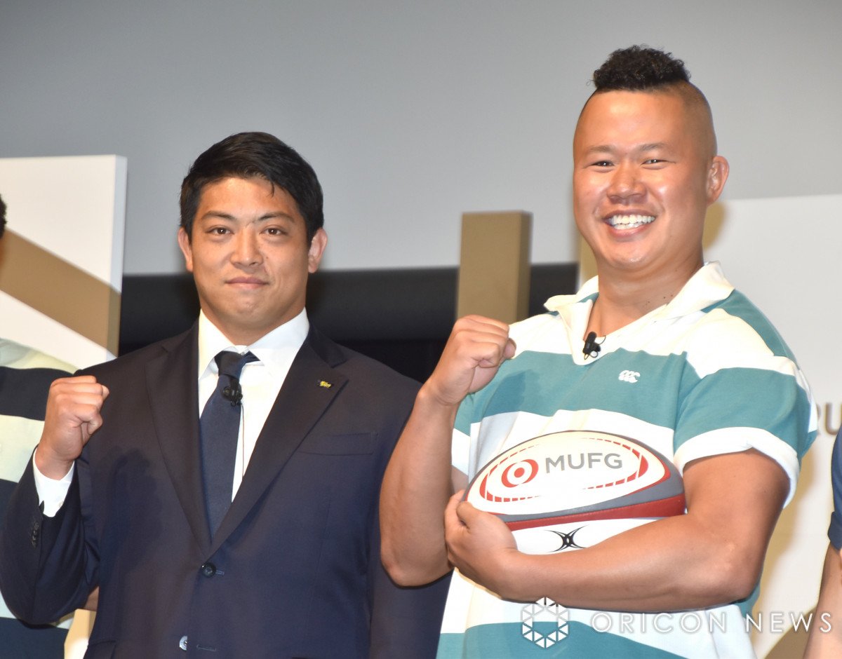 『NTTジャパンラグビー リーグワン 2024-25 プレーオフトーナメント』メディアカンファレンスに出席した(左から)坂手淳史、しんや(C)ORICON NewS inc. (1/20枚)
