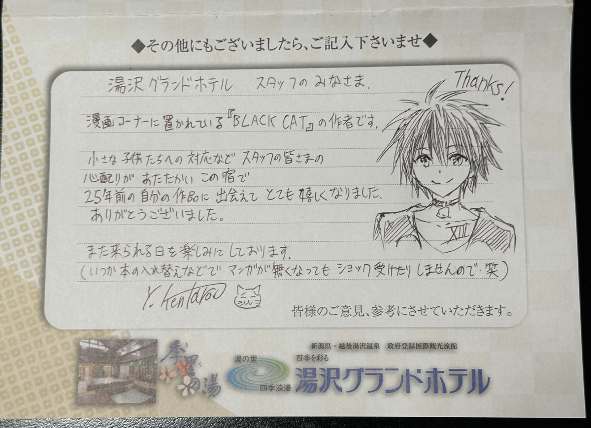 ジャンプ漫画家・矢吹健太朗氏、湯沢グランドホテルの対応に感動 25年前の作品見つけメモ残し大反響「大騒ぎになるやんけ!」「聖地にする神」