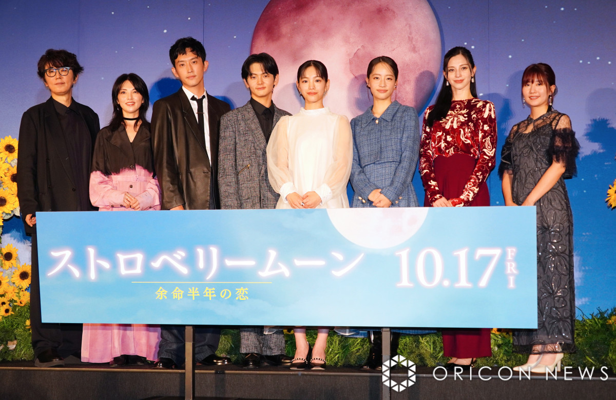 映画『ストロベリームーン 余命半年の恋』完成披露試写会に登壇した(左から)ユースケ・サンタマリア、田中麗奈、杉野遥亮、齋藤潤、當真あみ、池端杏慈、中条あやみ、酒井麻衣監督 (C)ORICON NewS inc. (9/11枚)