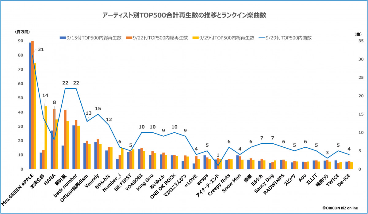 【最新版】アーティスト別TOP500合計再生数推移とランクイン楽曲数(C)ORICON BiZ online (3/4枚)