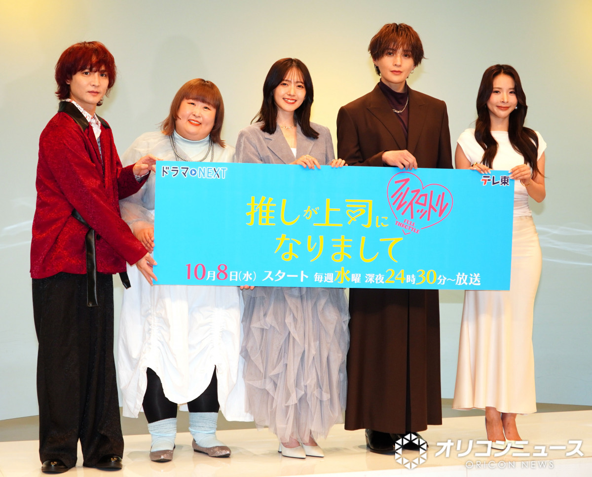 『推しが上司になりまして フルスロットル』記者会見に登壇した(左から)すがちゃん最高No.1、かなで、鈴木愛理、八木勇征、ミチ (C)ORICON NewS inc. (2/10枚)