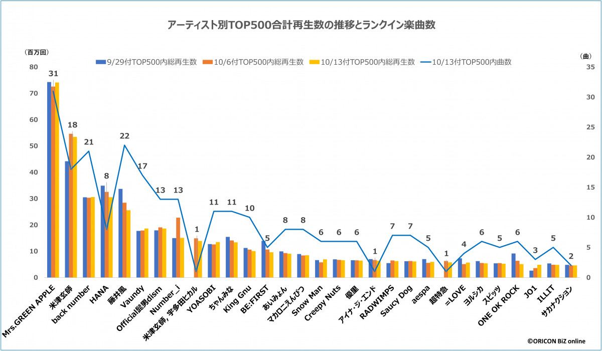 【最新版】アーティスト別TOP500合計再生数推移とランクイン楽曲数(C)ORICON BiZ online (5/19枚)