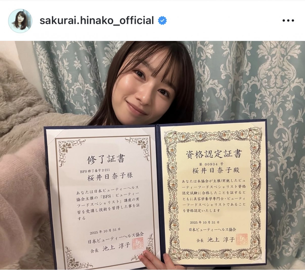「勉強したことを活かして、美を磨いていきたいと思います」ビューティーフードアドバイザー、ビューティーフードスペシャリストの資格を取得した報告をする桜井日奈子(写真は @sakurai.hinako_official より) (1/3枚)
