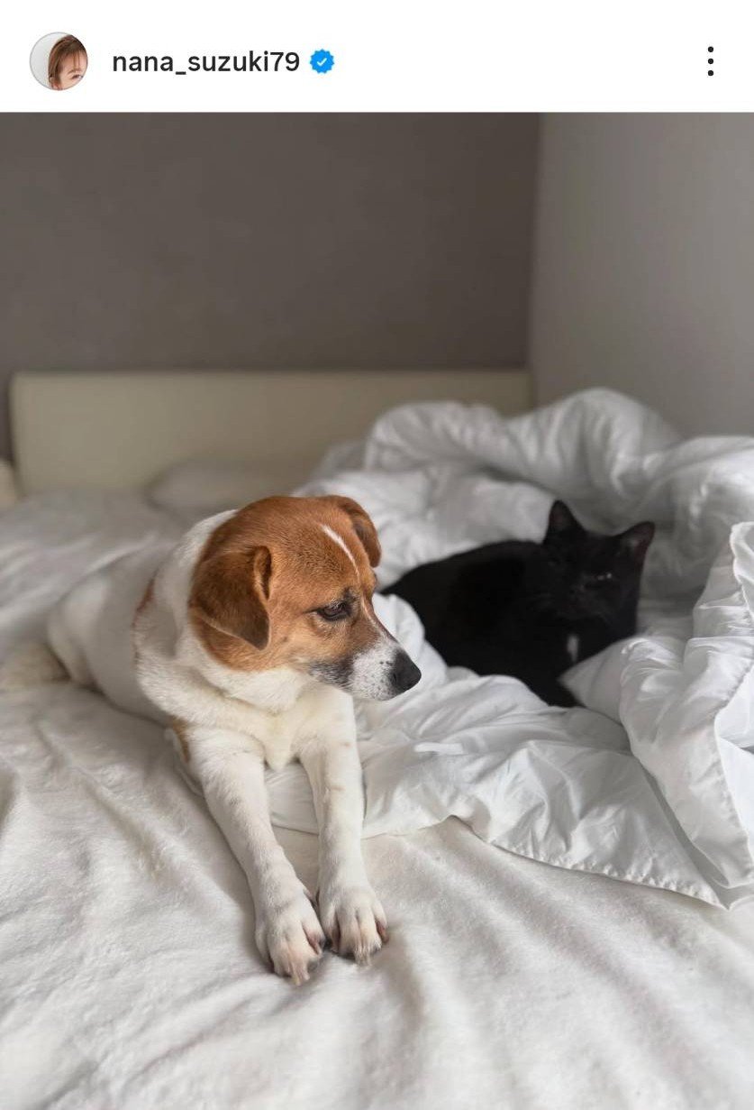 鈴木奈々「私のベッドの上にいつもモモちゃんとクロちゃんが一緒にいます」(写真はインスタグラム @nana_suzuki79 より) (2/8枚)