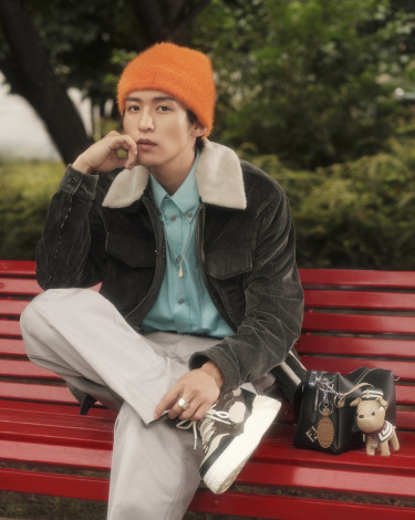 シアリングの襟がついたコーデュロイのジャケットにカーゴパンツ、鮮やかなオレンジのニットビーニーを合わせた、遊び心あふれるスタイルで登場。スターリングシルバーのメンズジュエリーコレクション「フェンディ 925(FENDI 925)」のネックレスやリングを合わせ、洗練された個性を際立たせる。
