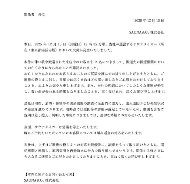 赤坂のサウナ施設で火災 来店中の客2人が死亡 運営会社が謝罪と営業停止を発表