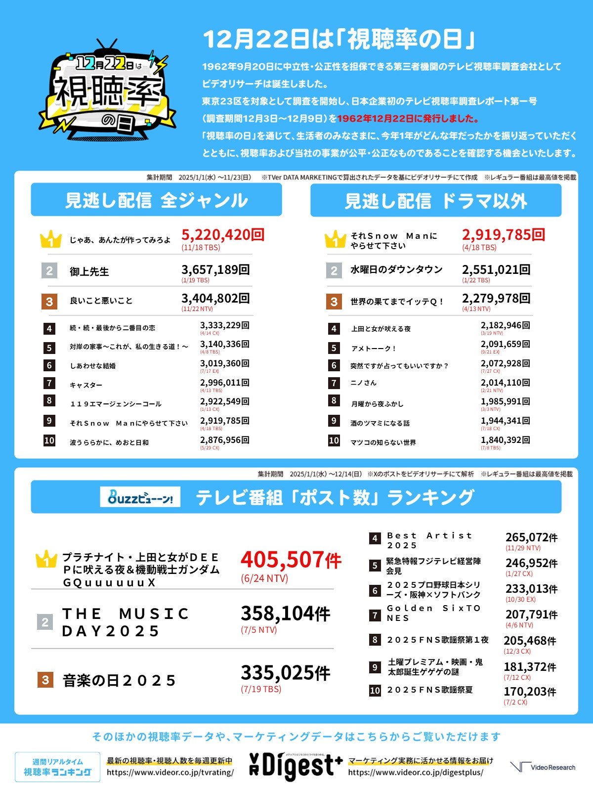 今年の視聴率トップは『カブス×ドジャース』ビデオリサーチが速報値発表 見逃し配信1位は『あんたが』