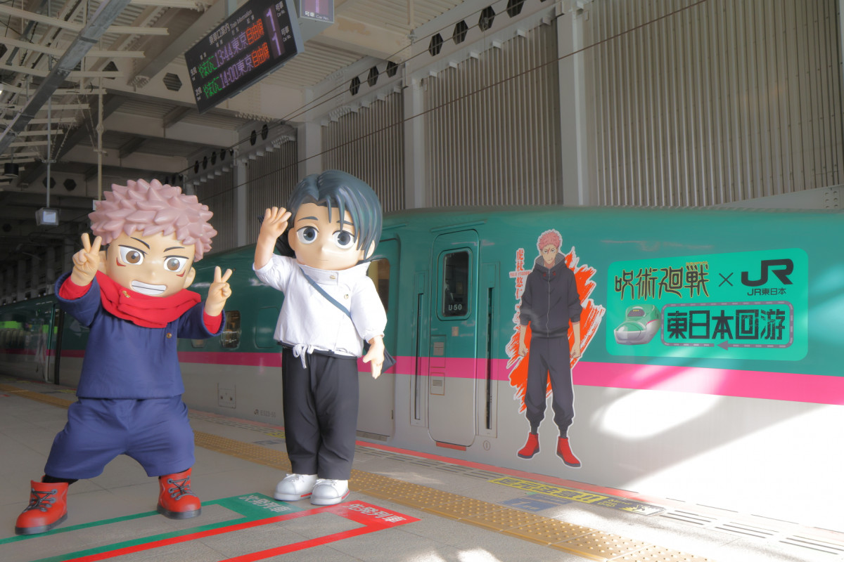 ラッピング新幹線と「特級フォトセッション」する(左から)悠仁くん、憂太くん(C)芥見下々/集英社・呪術廻戦製作委員会 (6/18枚)