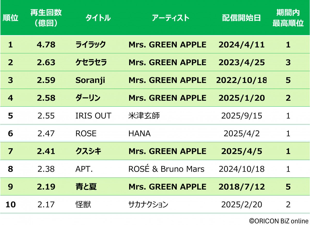 • 「第58回オリコン年間ランキング2025」2冠を受賞したMrs. GREEN APPLE(左から)藤澤涼架、大森元貴、若井滉斗 デビュー10周年を迎えた2025年に大躍進したMrs. GREEN APPLE Mrs. GREEN APPLE「ダーリン」(権利元:ユニバーサルミュージック/1月20日配信開始) Mrs. GREEN APPLE「ダーリン」MVサムネイル オリコン年間ストリーミングランキングTOP10 オリコン年間ストリーミングランキング「2025年度配信楽曲」TOP10 オリコン年間ストリーミング1〜4位楽曲の週間再生数推移